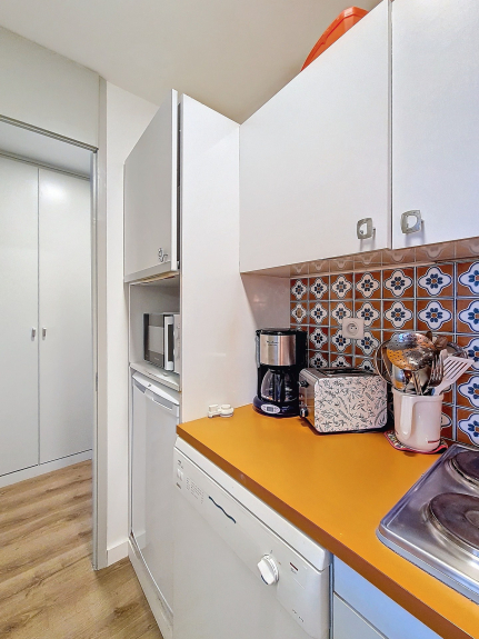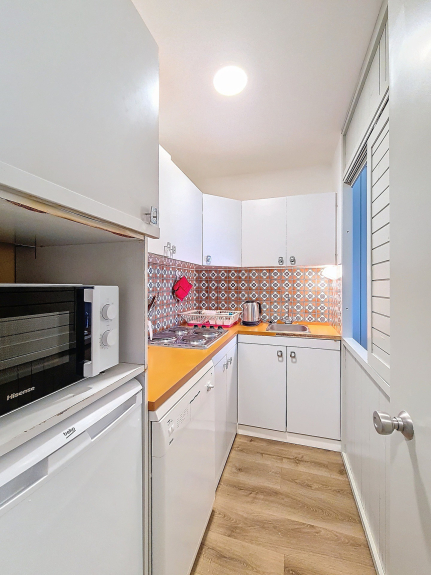 Cocina equipada con 4 placas vitrocerámicas, frigorífico, horno convencional, lavavajillas, cafetera, tostadora y hervidor de agua.