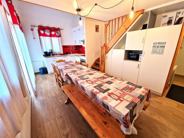 Este piso del 3er piso (sin ascensor) fue renovado en 2020 para ofrecer un ambiente moderno conservando el encanto de un chalet de montaña. Se encuentra en un chalet de 6 pisos situado a 200 m de las pistas y a 500 m del centro de la estación (tiendas, escuela de esquí, oficina de turismo, etc.).