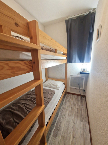 - 2 literas en un dormitorio pequeño, puerta y ventana.