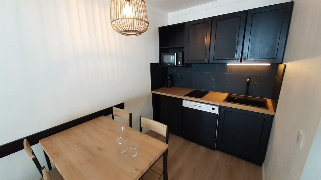 - Zona de cocina con placa de inducción de 2 fuegos, frigorífico, lavavajillas, horno-microondas combi.