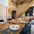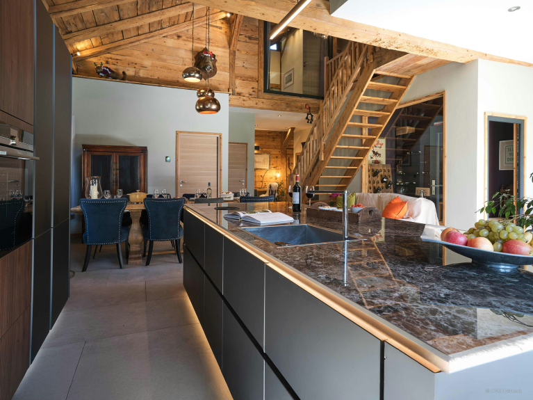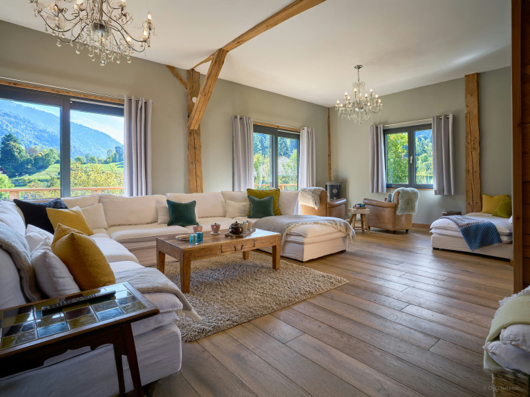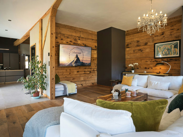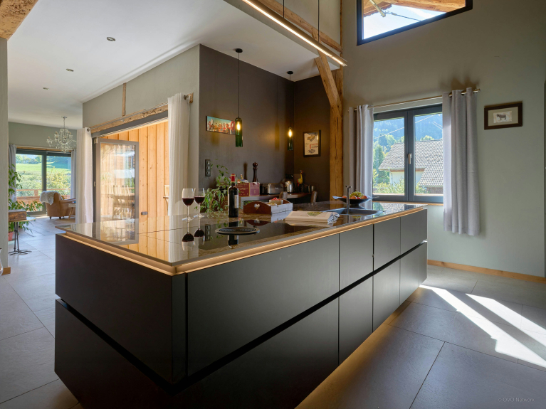 La espaciosa sala de estar se caracteriza por los colores suaves y los materiales naturales. El salón es cálido y acogedor, con sofás, sillones, televisor y estufa de leña. Enfrente está la moderna cocina, con una encimera central, tres hornos y una placa de inducción, así como una gran mesa de comedor. El espacio se complementa con una bodega y dos mesas de teletrabajo.