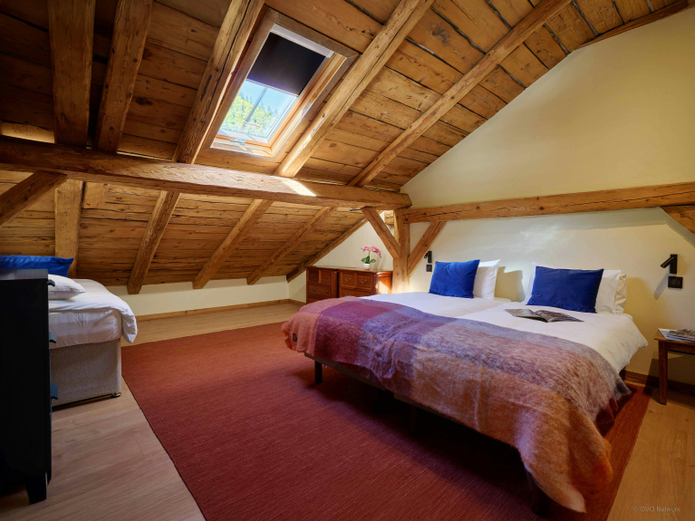 Bajo las vigas de la planta superior, tres habitaciones abuhardilladas crean un espacio íntimo lleno de encanto. Uno de ellos, muy luminoso, dispone de balcón privado y de un elegante cuarto de baño con ducha a ras de suelo, lavabo doble y bañera en isla de cobre. El dormitorio infantil cuenta con litera, escritorio y zona de juegos. El último dormitorio, más espacioso, combina una cama doble con una cuna. Un cuarto de ducha con aseo da servicio a estos dos últimos dormitorios.