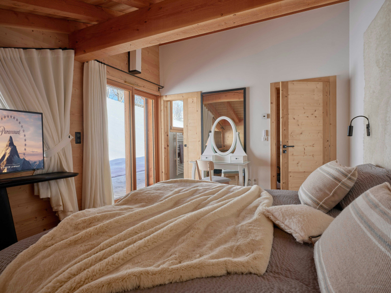 Con sus cinco habitaciones, Condor Andino es un verdadero chalet multigeneracional. Los adultos disfrutan de cómodas habitaciones dobles, mientras que los más jóvenes disfrutan de su dormitorio con literas. Una de las habitaciones está adaptada para personas mayores, con camas eléctricas y barra de apoyo en la ducha. Algunas de estas habitaciones dan a un balcón con vistas a las cumbres, mientras que otras dan al jardín.
