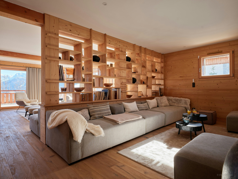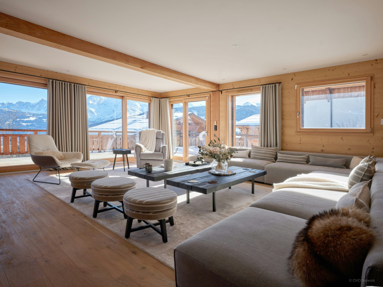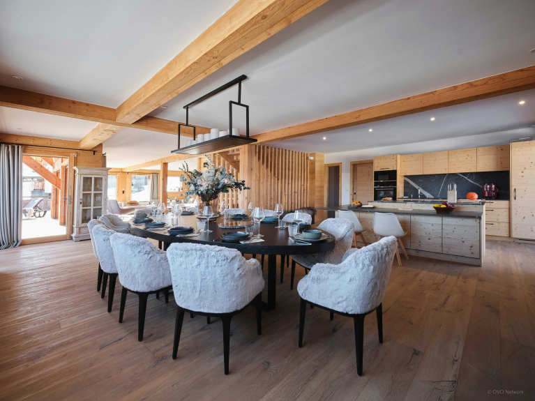 Su gran salón diáfano es el corazón del chalet. Orientada hacia la montaña, goza de mucha luz natural y de balcones que amplían el espacio de forma natural. Su chimenea central calentará las veladas en los dos salones. La cocina está totalmente equipada y la mesa de comedor es suficientemente grande para acoger a toda la familia.