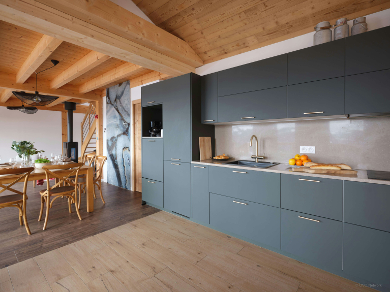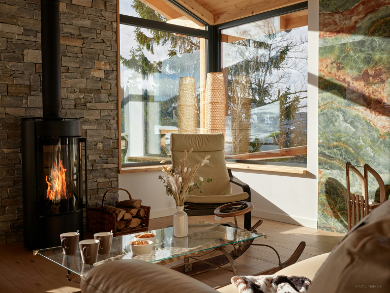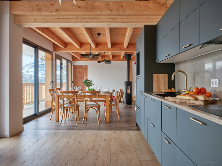 El salón, luminoso gracias a sus grandes ventanales, sirve de punto de encuentro en torno a una estufa de leña, mientras que la cocina, totalmente equipada, se integra perfectamente en el espacio. Una segunda zona de estar permite disfrutar plenamente del paisaje.