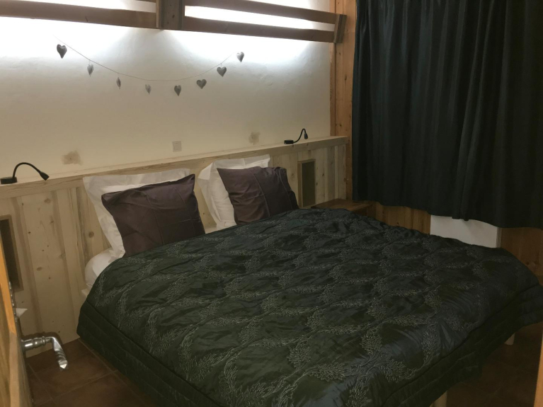 Piedra y madera, mobiliario acogedor de estilo montañés, este confortable apartamento tiene capacidad para 8 personas. Salón doble con cocina, 4 habitaciones, 4 cuartos de baño y wc, terraza y espacio exterior con árboles, garaje para bicicletas, guardaesquís, secador de zapatos.