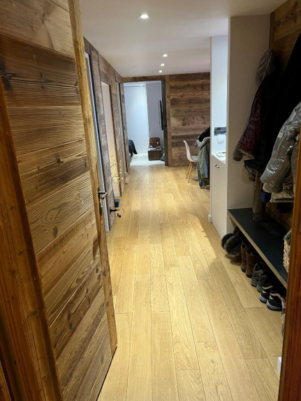 Entrée/vestiaire, WC, Ski room (lave-linge + lèche-linge + aspirateur + nombreux casiers pour rangement vêtements ski), Cuisine américaine avec ilot central (cuisine équipée : frigo américain + four + hotte + lave-vaisselle + matériel de cuisine + vaisselle + verrerie + machine Nespresso + grille-pain) Salon, Salle à manger pour 10 personnes.