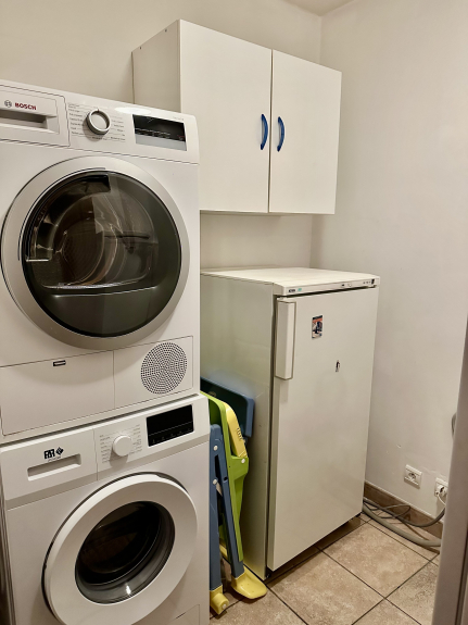 Ripostiglio con lavatrice, asciugatrice, frigorifero extra, congelatore.