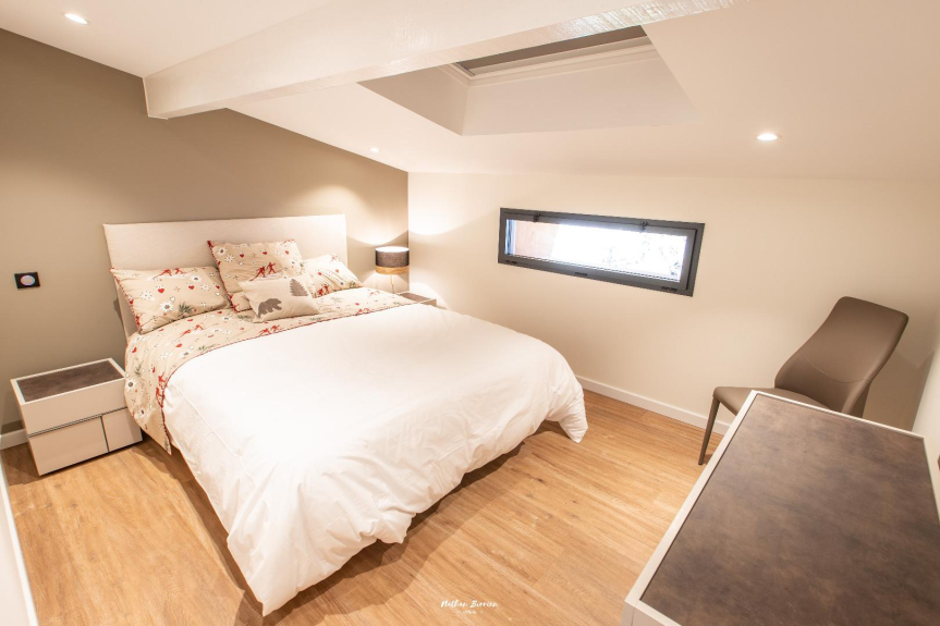In mansarda si trova Cocoon, con 8 posti letto. L'ampia zona giorno di 30 m² comprende una cucina a vista completamente attrezzata, una sala TV conviviale con stufa a legna, una zona pranzo/apéro e un salotto con due grandi divani che può essere trasformato in sala da pranzo, con una vista eccezionale sul resort e sui Pirenei.