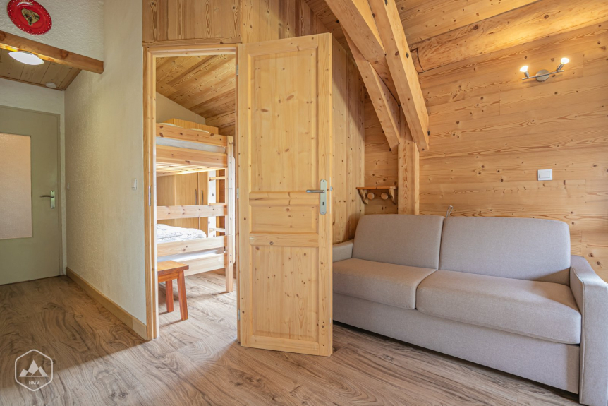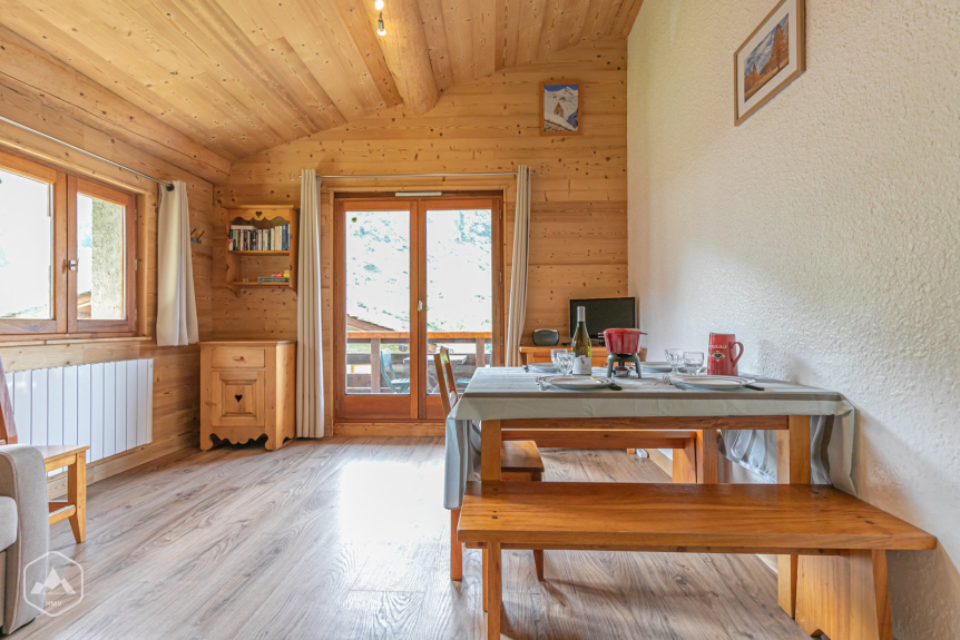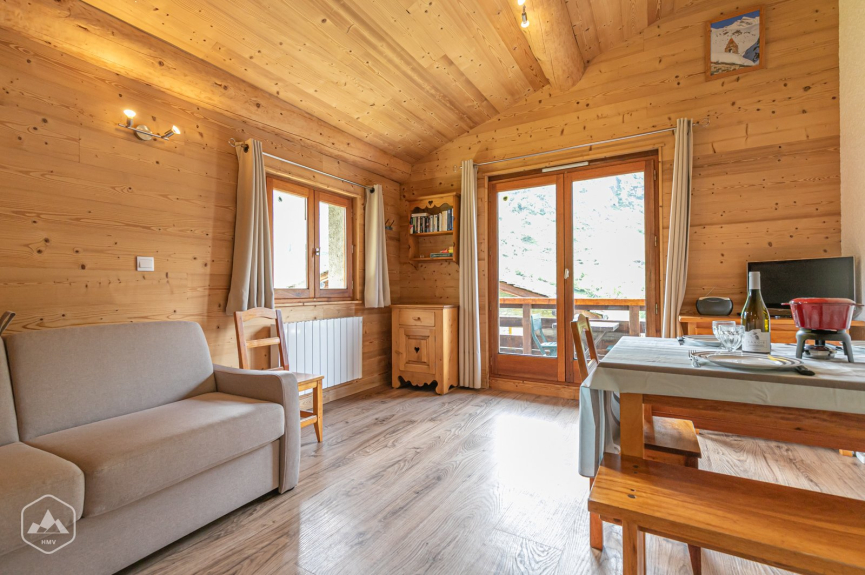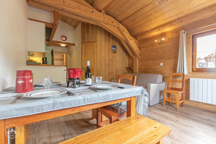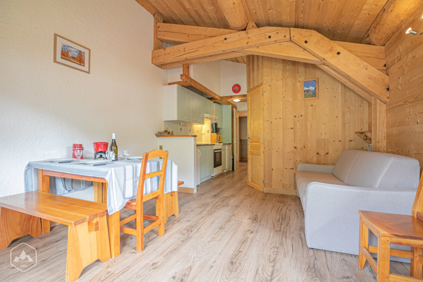 L'appartamento Linaigrette 3 è stato recentemente ristrutturato con materiali sani (lana di legno, abete rosso, abete). Il soggiorno con i suoi alti soffitti, l'ossatura esposta e chiara, la calda boiserie e il bovindo danno una stanza piacevole e luminosa che si apre sul balcone esposto a sud con una chiara vista sulle piste e le montagne circostanti.