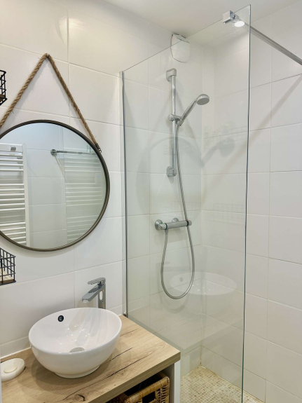 Bagno: lavabo, doccia. WC separato con lavatrice.