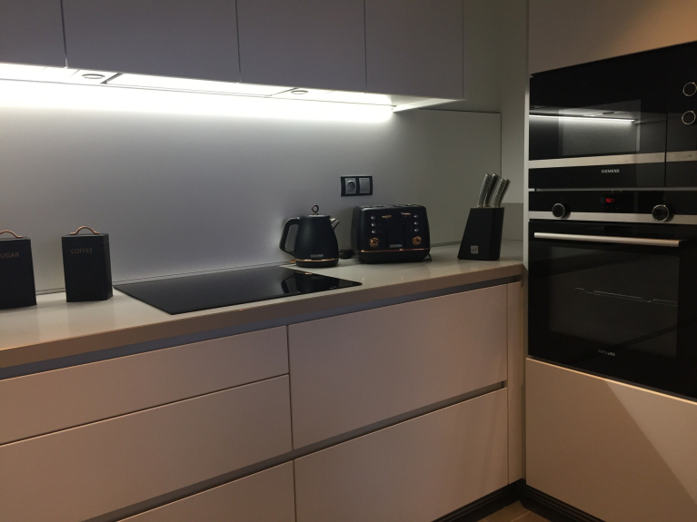 Cucina aperta: lavastoviglie, forno, microonde, piano cottura a induzione, bollitore, tostapane e caffettiera.