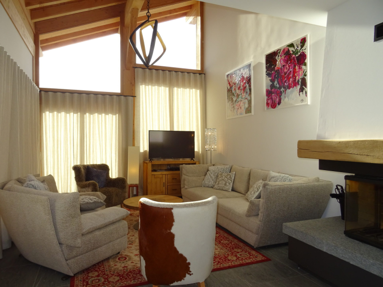 Piacevole soggiorno con camino, apertura sulla terrazza attrezzata con una vasca idromassaggio con vista panoramica sulle montagne circostanti. TV e lettore DVD.