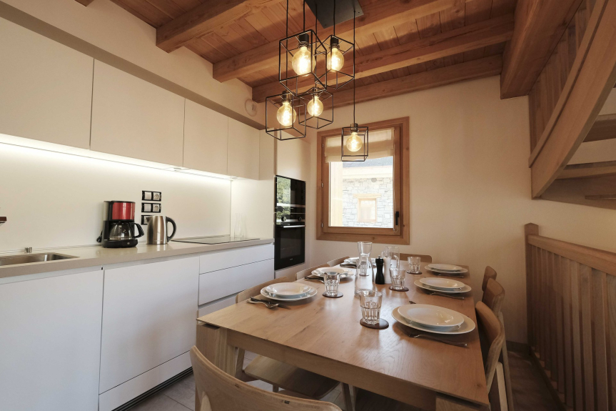 Cucina completamente attrezzata con zona pranzo: piano cottura a induzione, lavastoviglie, forno, forno a microonde, bollitore, tostapane e macchina da caffè elettrica.