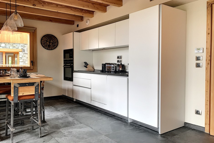 Cucina completamente attrezzata: piano cottura a induzione, lavastoviglie, forno, microonde, bollitore, tostapane e macchina per il caffè.
