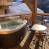 Soggiorno con televisione e bruciatore a legna che si apre su un balcone di 14m² dotato di vasca idromassaggio, tavolo e sedie.