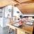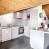 Cucina aperta attrezzata con 4 piastre a induzione, frigorifero, forno, microonde, lavastoviglie.