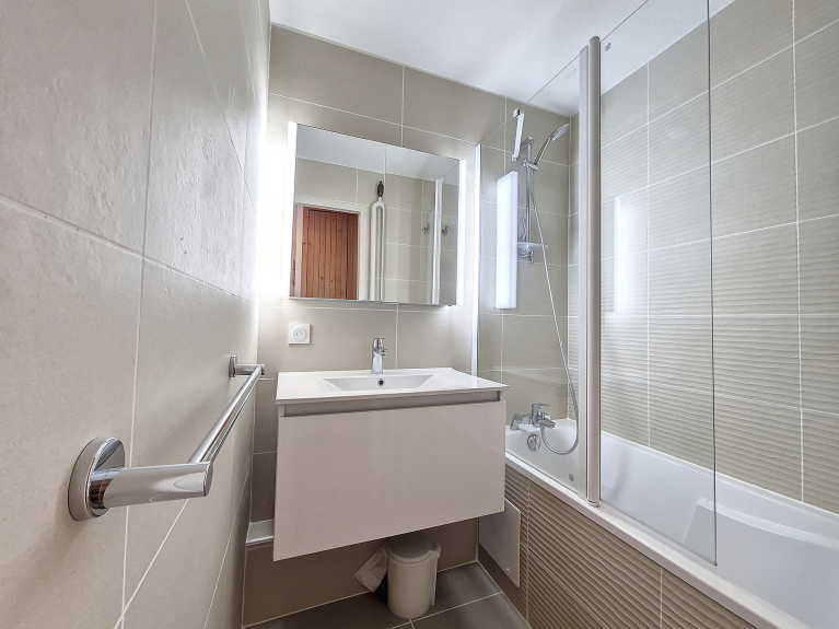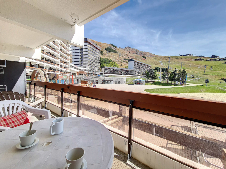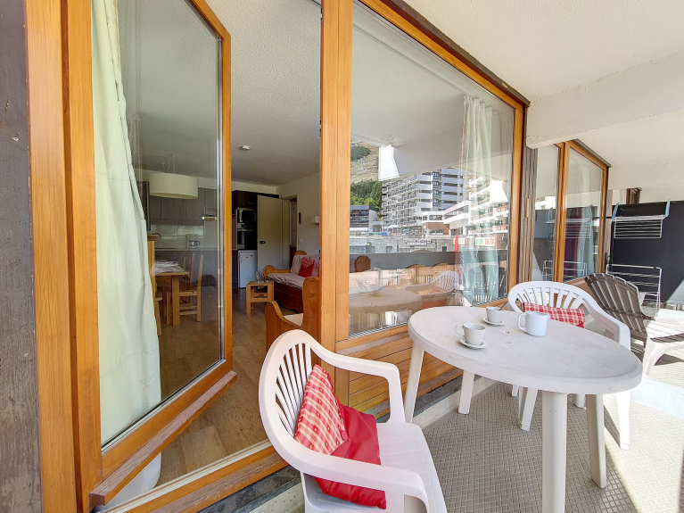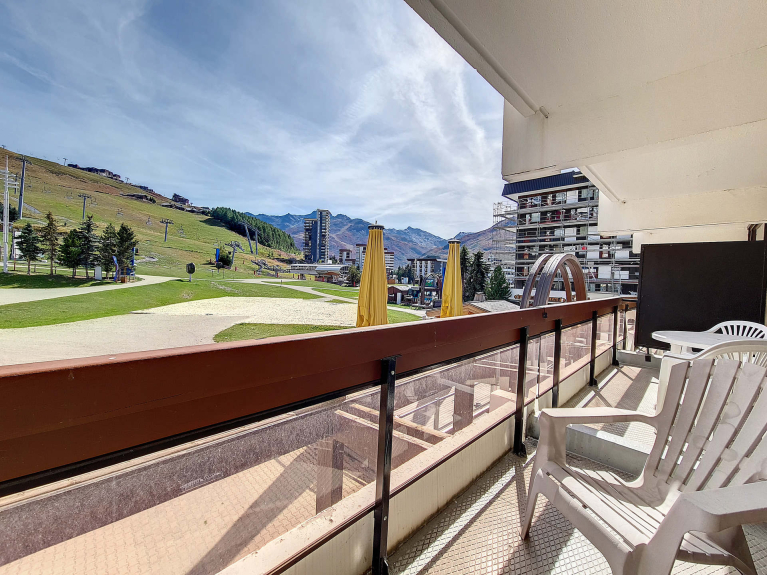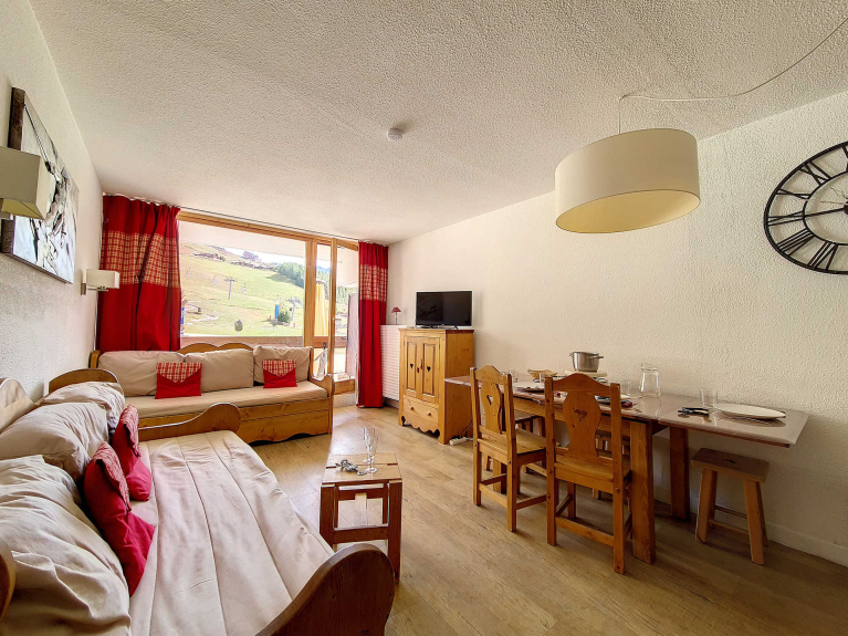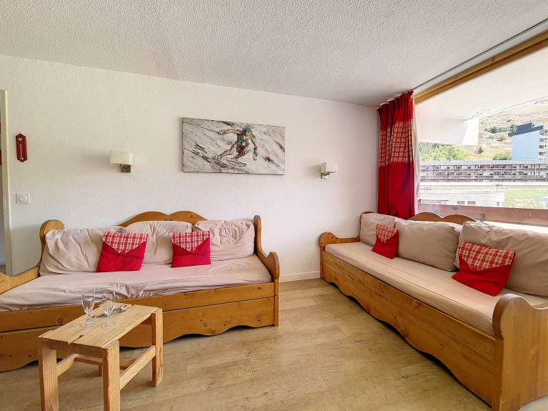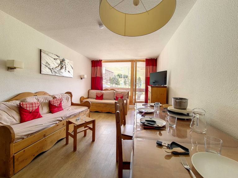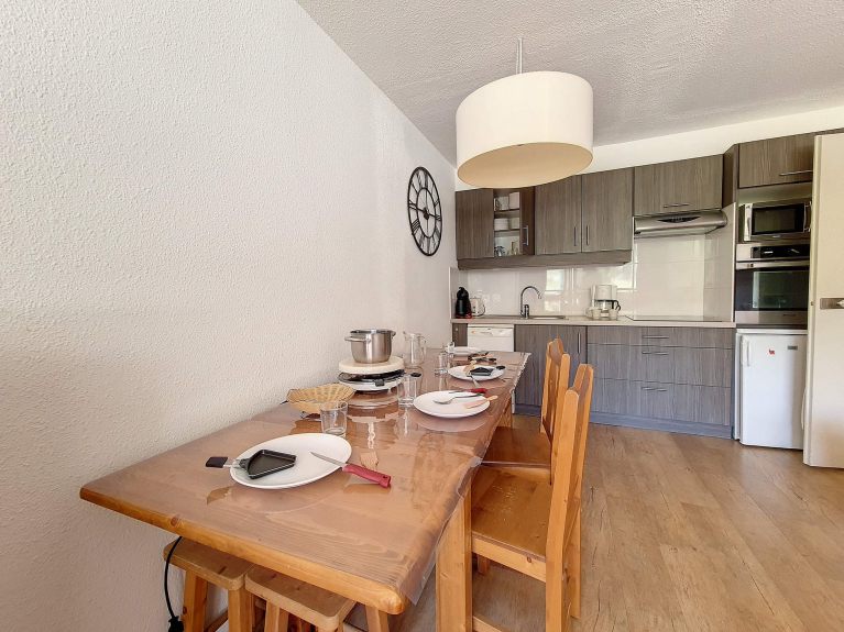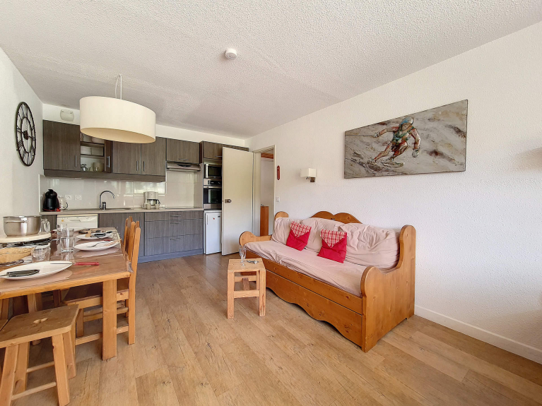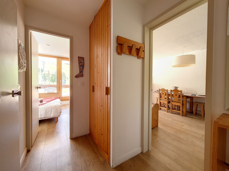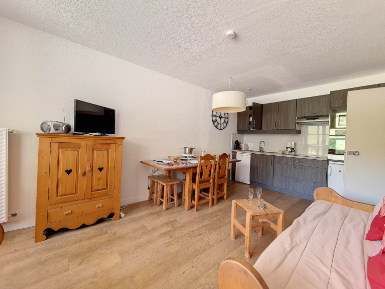 Un bilocale di 36m² attrezzato per 6 persone. Si trova al 1° piano (piano terra in ascensore) di una residenza ski-in ski-out, sulla Croisette con accesso a tutti i servizi della stazione in ascensore, molto vicino alla partenza degli impianti di risalita e alla partenza delle FSE. L'appartamento ha un balcone esposto a sud.