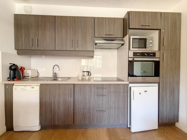 Cucina completamente attrezzata con forno tradizionale + forno a microonde, frigorifero, 3 piastre a induzione, cappa aspirante, lavastoviglie, macchina da caffè, bollitore, tostapane, macchina da caffè dolce gusto