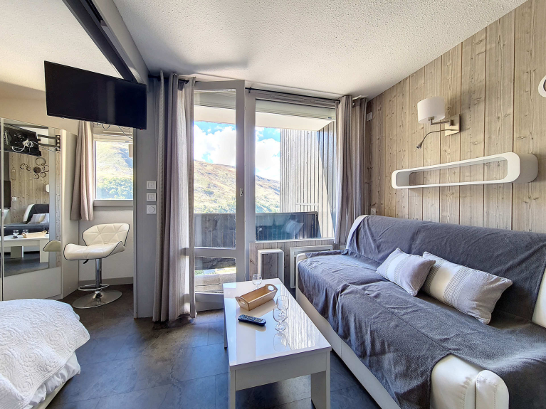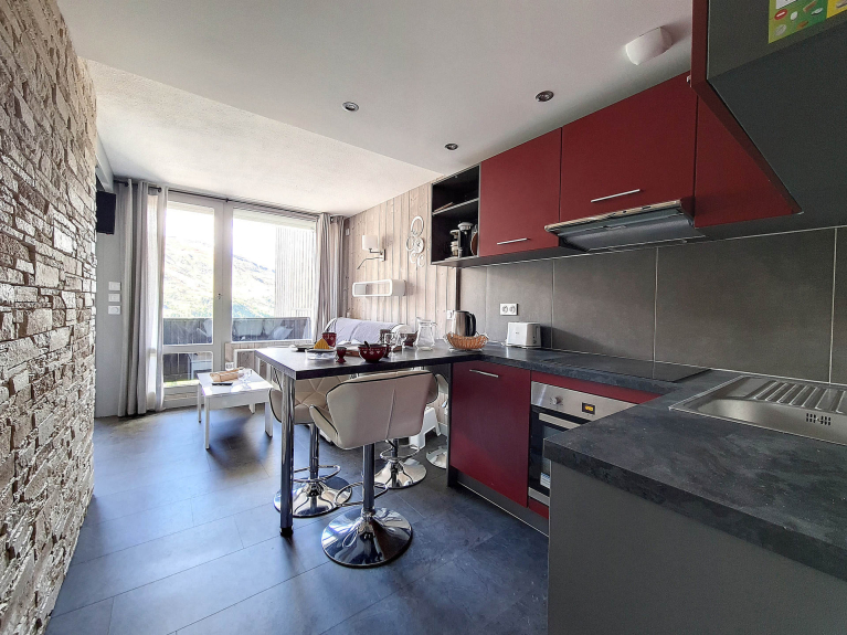 Stupendo appartamento completamente rinnovato di 27 m² con una zona notte chiusa e una cabina per 4 persone. Si trova al 5° piano e ha un balcone rivolto a ovest.