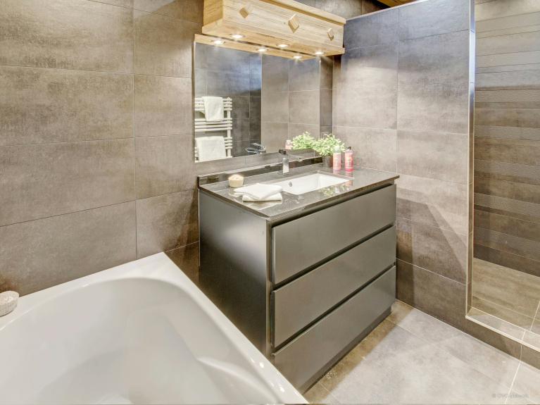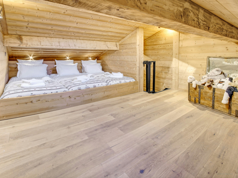 Questo bellissimo chalet a schiera può ospitare 12 persone (8 adulti al massimo) in 6 camere da letto: 4 camere doppie, una delle quali ha un bagno in camera, e una suite familiare mansardata, composta da 3 zone notte - 1 con un letto matrimoniale, 1 con un letto singolo e un piccolo dormitorio con 3 piccoli letti singoli per i bambini, un'area giochi e una cassa piena di giocattoli morbidi! Ci sono anche 2 bagni separati.