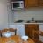 Cucina in muratura con 2 piastre, microonde grill, frigorifero, lavastoviglie, tostapane, bollitore e macchina da caffè.