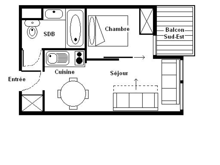 Bilocale con una parete divisoria mobile di 24 m² per 4 persone. Si trova al 3° piano con ascensore e ha un balcone rivolto a sud/est.