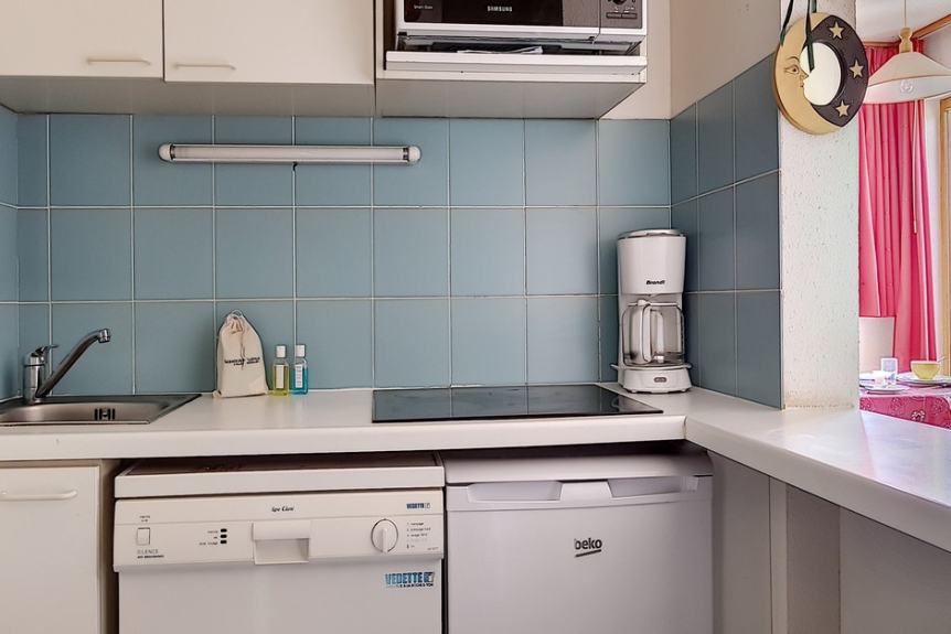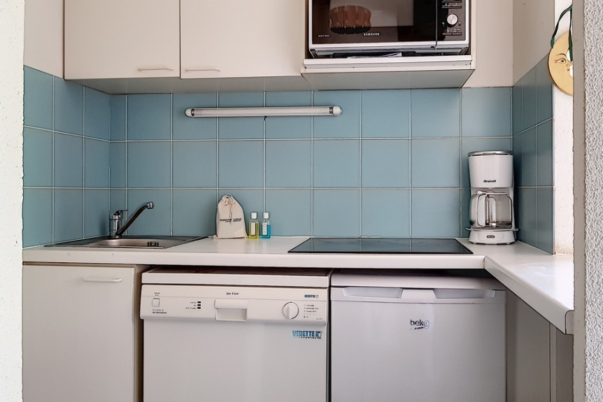Cucina attrezzata con 4 piastre in ceramica, frigorifero, microonde combinato, lavastoviglie, tostapane e macchina da caffè.