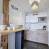 Cucina con 2 piastre elettriche, microonde, frigorifero, tostapane, bollitore e macchina da caffè.