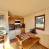 - Cucina aperta sul soggiorno: tre piastre in vetroceramica, mini forno, frigorifero, microonde, lavastoviglie.