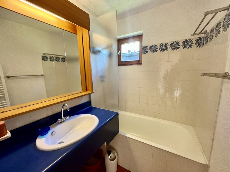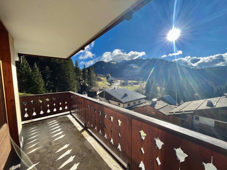 Un bilocale per sei persone, al primo piano, con una superficie di 37 m² e un ampio balcone ad angolo sud-est con vista sul Mont Charvin e sulla valle.
