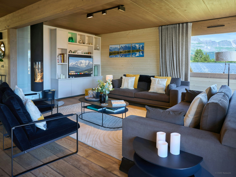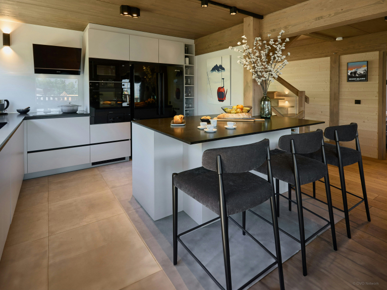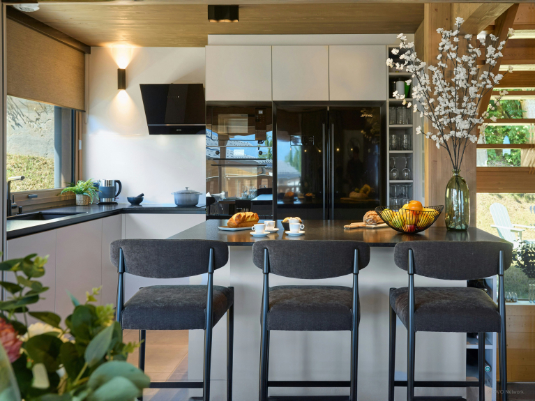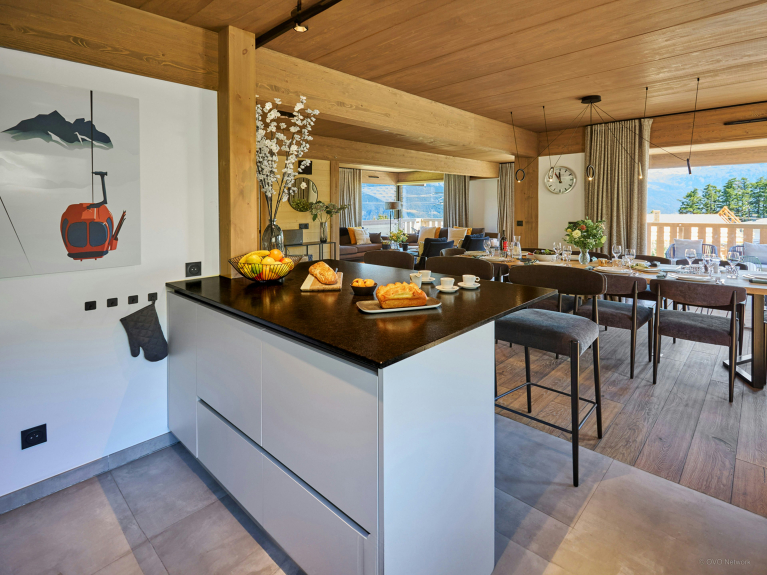 Al primo piano, l'ampia zona giorno è particolarmente luminosa, grazie alle grandi finestre a golfo e alla porta-finestra che si apre sulla terrazza panoramica. L'arredamento in stile scandinavo offre un'atmosfera rilassante e ci si può riunire intorno al camino sospeso o al tavolo da pranzo. La cucina è completamente attrezzata, con un bancone centrale e sgabelli.