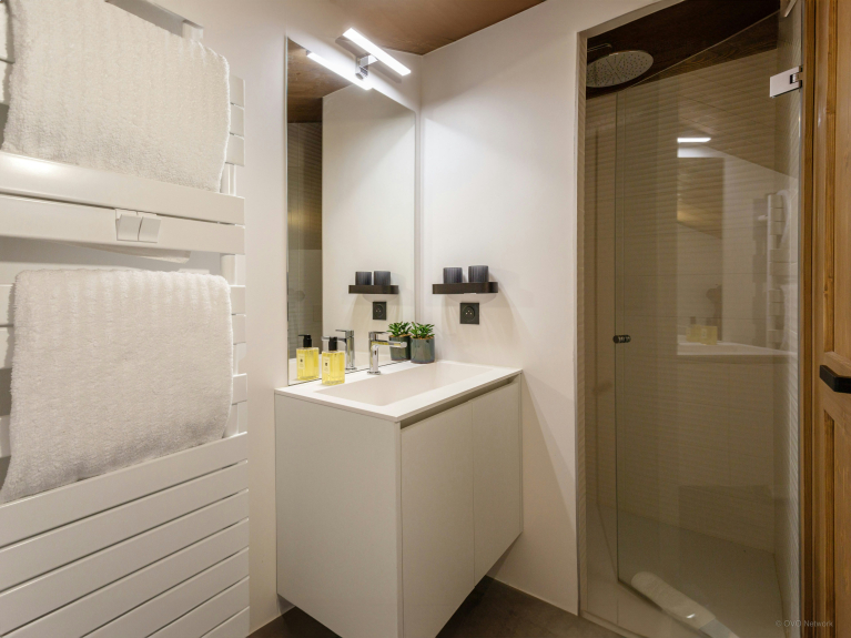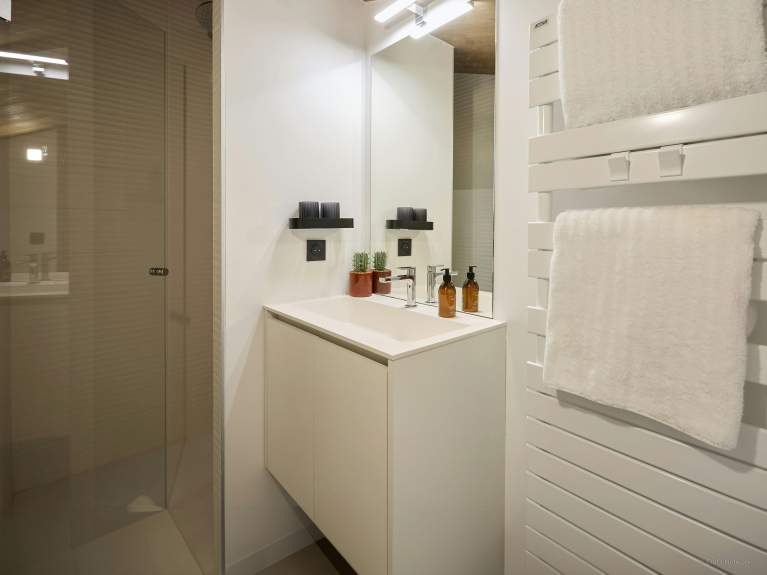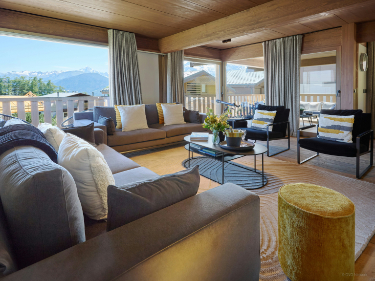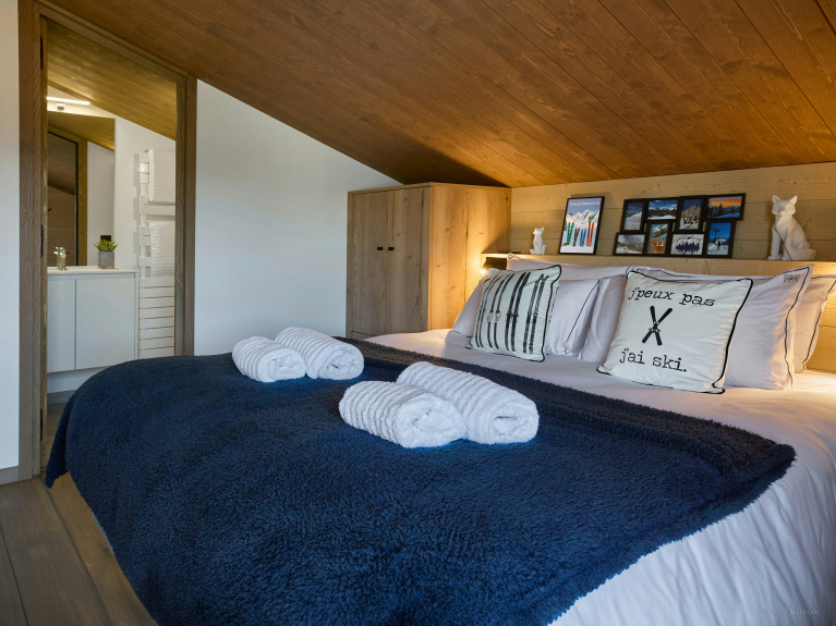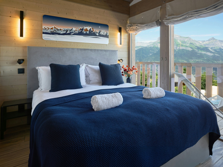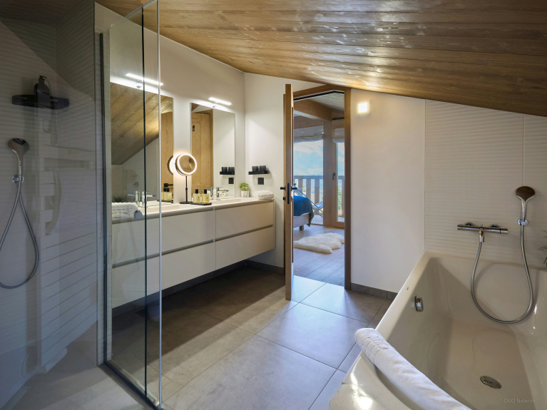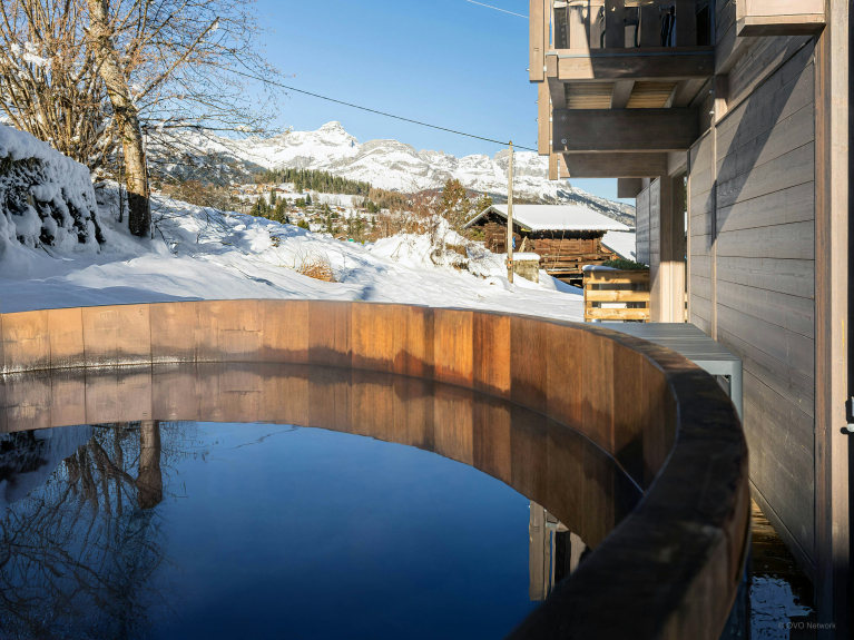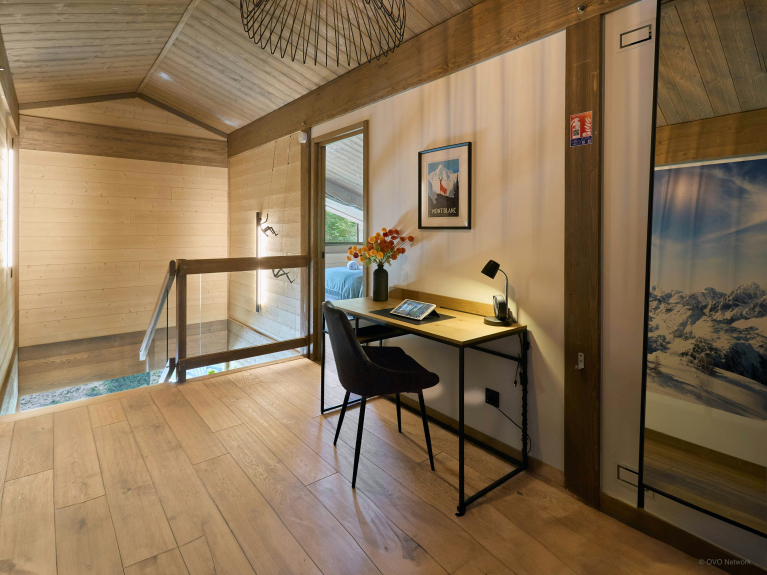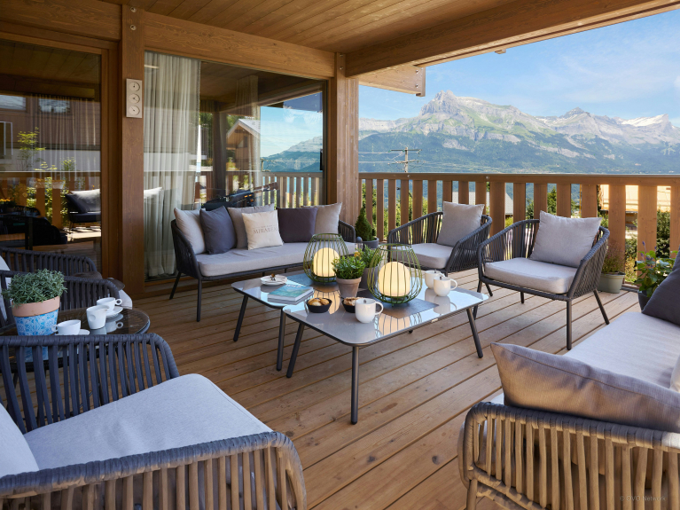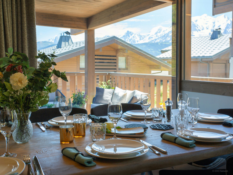 La spaziosa terrazza è dotata di una zona salotto riparata, di un secondo tavolo da pranzo e di una vasca nordica, una sorta di jacuzzi senza bolle. È il luogo perfetto per ammirare la carismatica silhouette del massiccio del Monte Bianco.
