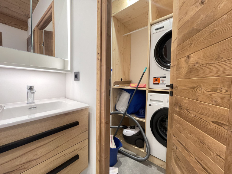 - Un bagno con vasca, doccia, doppio lavabo e accesso a una toilette separata, e una lavanderia con lavatrice e asciugatrice.