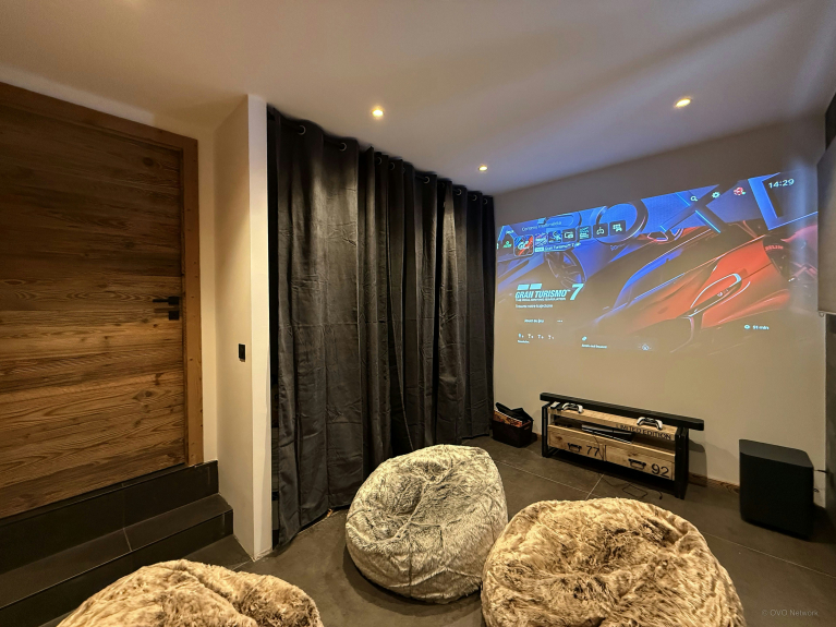 Al piano terra si trovano due camere doppie e un dormitorio con due letti a castello. Ognuna di queste camere dispone di un elegante bagno con doccia e due di esse si aprono su una terrazza, dove si trovano la vasca idromassaggio e le sedie a sdraio. I bambini potranno usufruire di una sala giochi privata, dotata di un videoproiettore, dove potranno giocare al computer o al karaoke. Questo piano dispone anche di una lavanderia e di un deposito sci con asciugascarponi riscaldato.