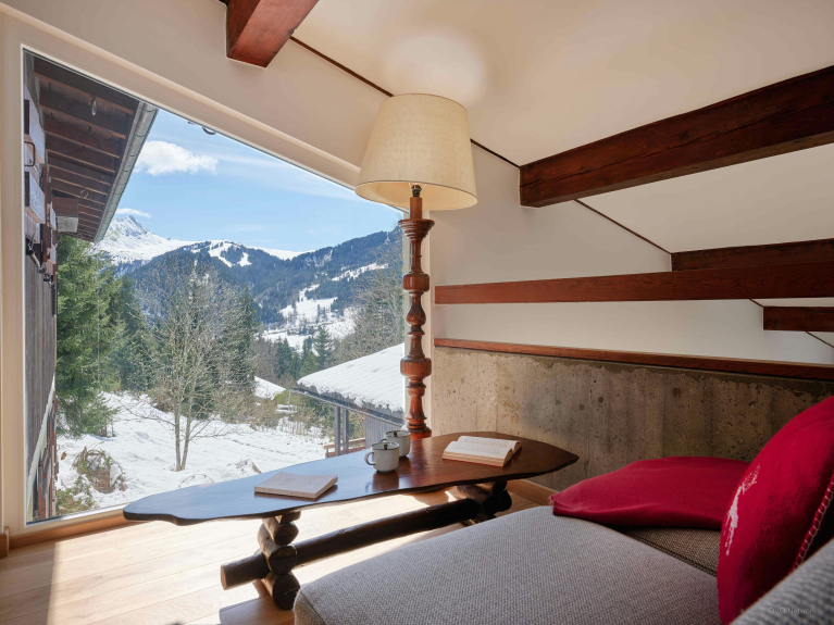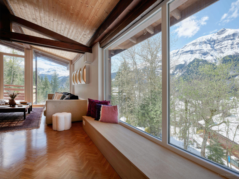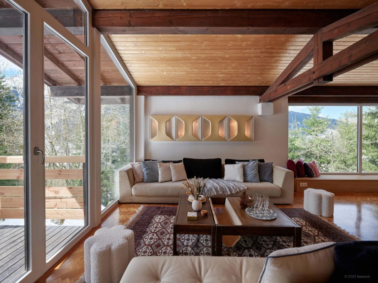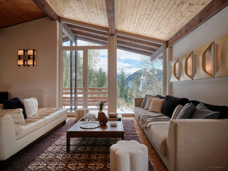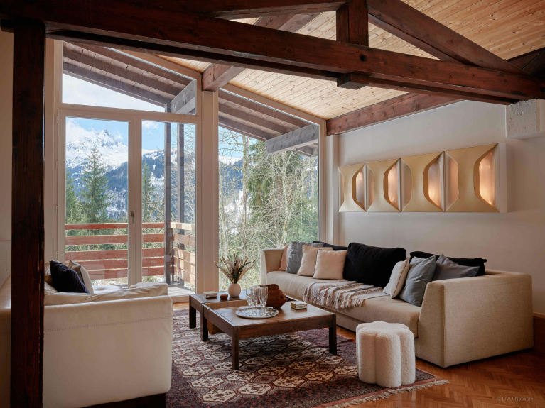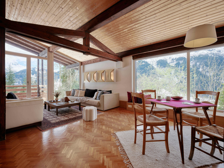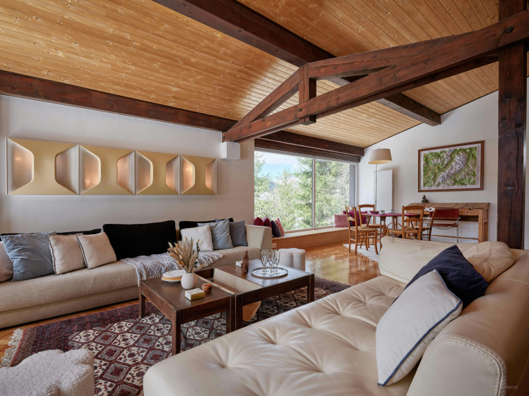 Lo Chalet Jorat dispone di ampi spazi per il relax di tutti. Tra questi, un grande salone al primo piano con tre divani, un televisore e un caminetto, un secondo salone più piccolo con un pianoforte, un mezzanino come zona lettura, un balcone e una terrazza.
