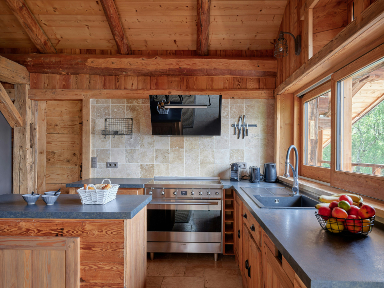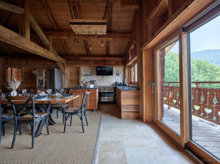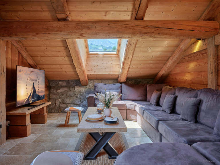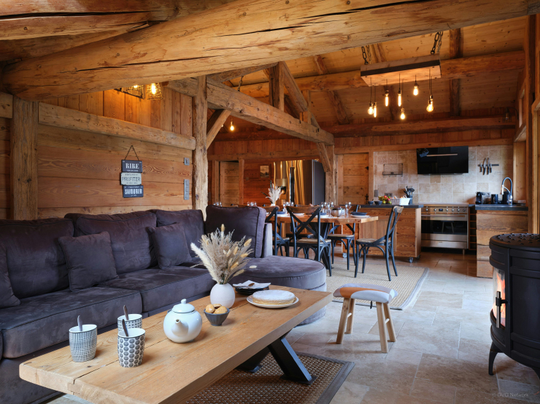 La zona giorno a pianta aperta comprende un accogliente salotto con un grande divano, TV e stufa a legna, una cucina completamente attrezzata e un tavolo da pranzo con tavolino da bar per riunirsi durante i pasti. Un balcone coperto offre una magnifica vista sulle montagne.