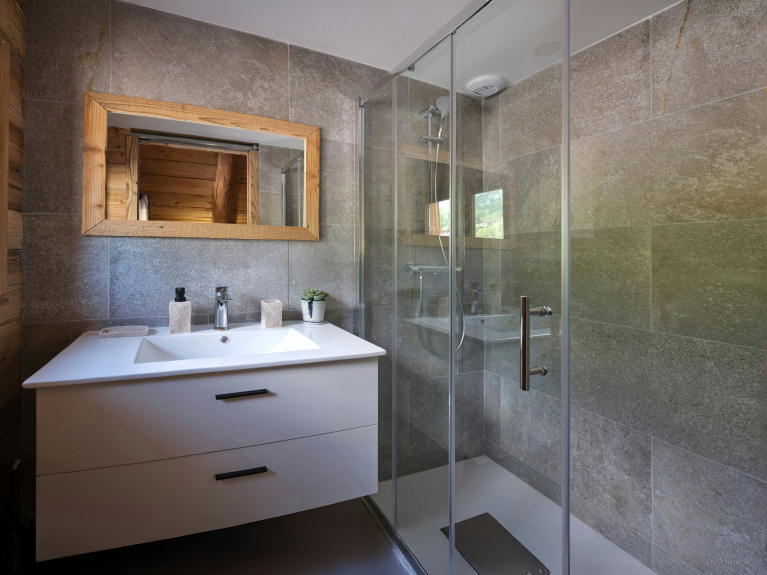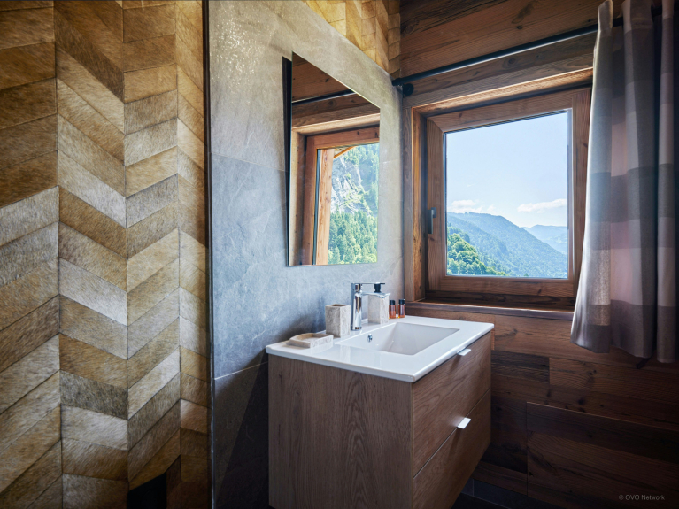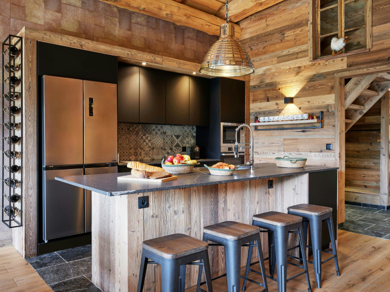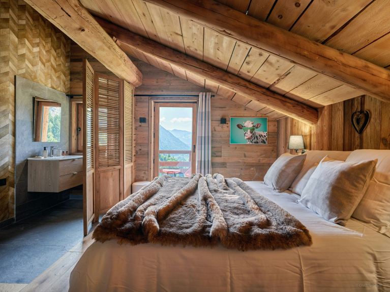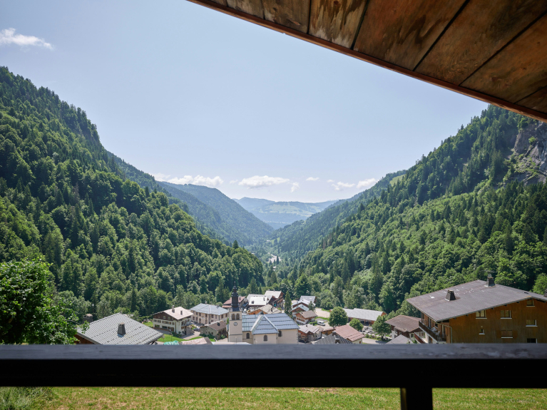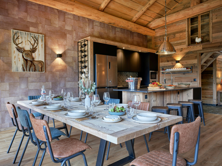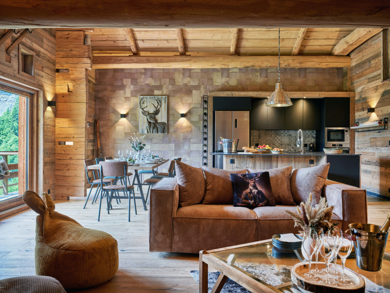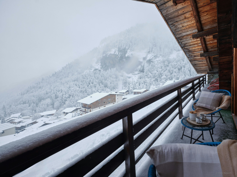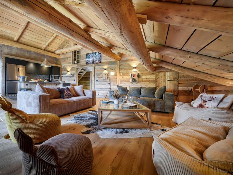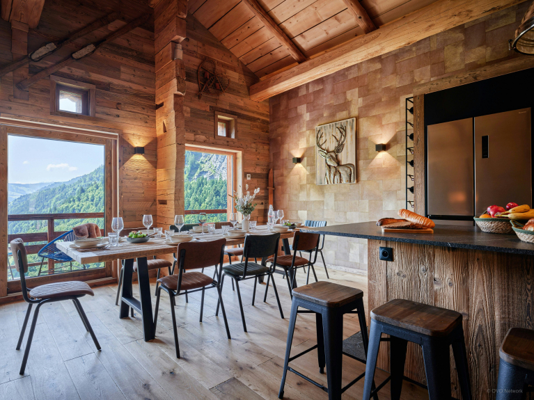 Appena entrati, sarete sedotti dall'accogliente soggiorno e dal suo arredamento savoiardo. Il soggiorno comprende un salotto conviviale con televisione, un grande tavolo da pranzo e una cucina compatta e ben attrezzata. Un grande bovindo si apre su un balcone, arredato con poltrone, da cui si gode una vista mozzafiato sulla valle.