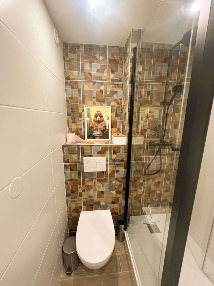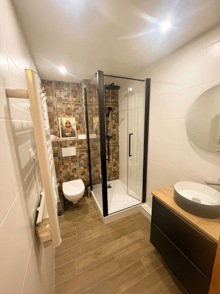 Bagno con doccia: doccia, lavandino, WC.