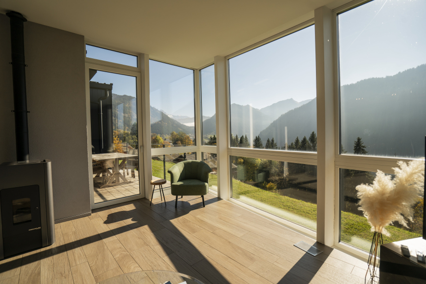 - Soggiorno con ampie vetrate panoramiche, divano, poltrona reclinabile, televisore con sound bar + stufa a pellet + zona pranzo.