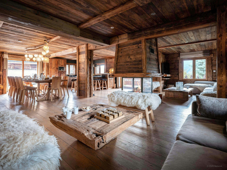 Il piano centrale è il cuore dello chalet. È composto da un ampio soggiorno elegantemente decorato, diviso in due salotti e riscaldato da un camino centrale. Un secondo salotto offre un'atmosfera più intima, ideale per leggere o condividere un drink. La cucina è completamente attrezzata e il tavolo da pranzo è spazioso.