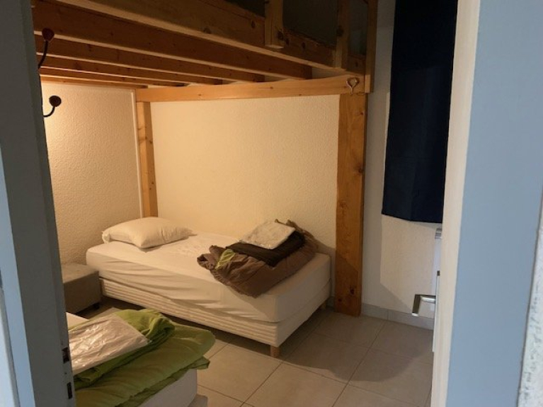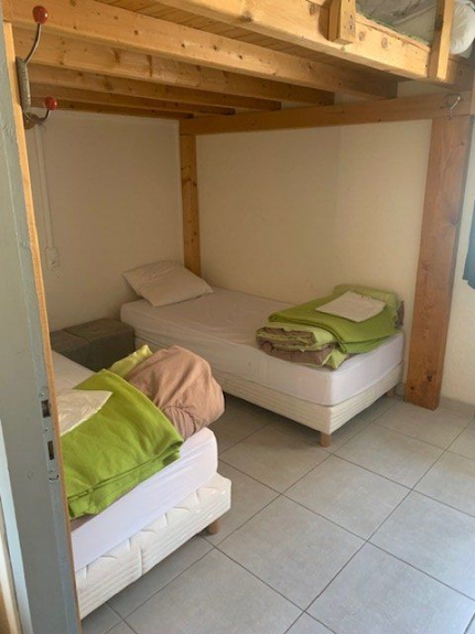 Et au dessus de la pièce à vivre ( grand salon), une grande mezzanine composée de 3 petits lits de 90cm/180cm et un lit de 120cm/180cm.