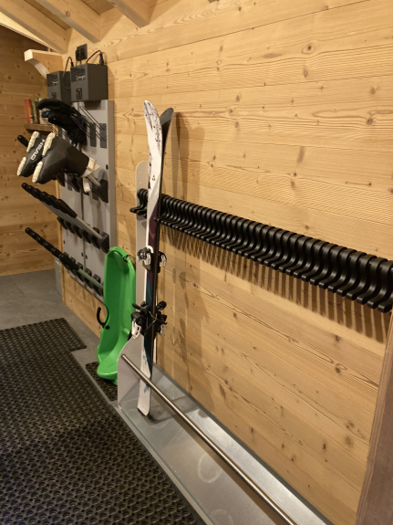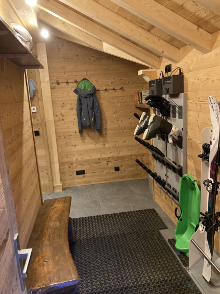A cet étage se trouvent également l’entrée, une salle d'eau avec douche et WC, un local à skis avec rangement mural pour skis et snowboards, sèche-chaussures et sèche-gants.