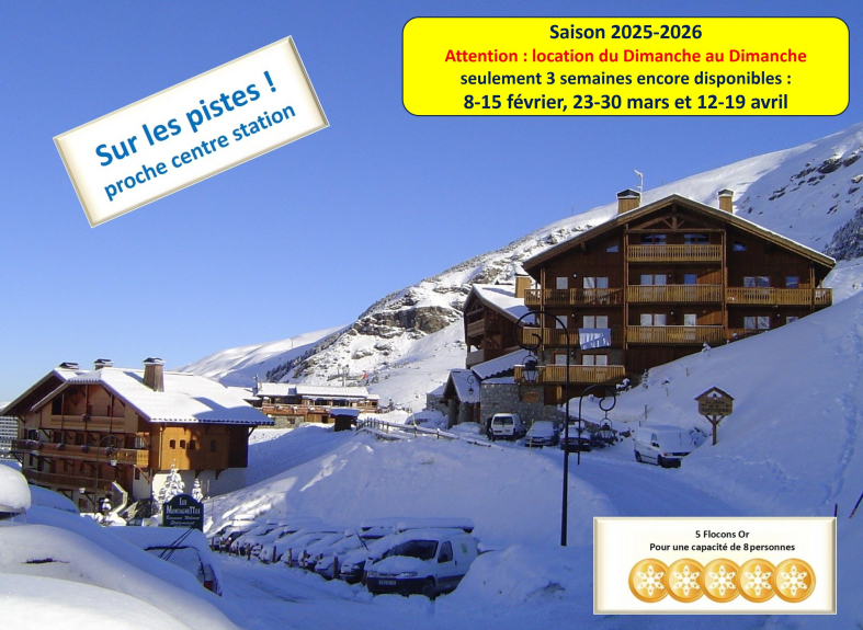 Appartement-chalet sur les pistes, situé tout près du centre station avec superbe vue orientation Ouest balcon, seul au 2eme et dernier étage, pour 8 a 9 personnes : 5 pieces 115 M2 décoration avec parquet dont 4 chambres de 16 à 12 M2 (couettes et draps tissus fournis) et salon-salle-à-manger-cuisine d’environ 38 M2, 2 WC, sdb et sde avec sèche-cheveux, lave linge-séchant, nouveau salon 7 places, Lit et chaise bébé sans supplément, 2 TV LCD 82 cm, Box wifi pour My Canal / NetFlix si abbonnement, DVD, barre son Bose, hifi, Hub quick charge 5 Smartphones ou tablettes, 4 grands placards, cuisine équipée complète, Nespresso, lave-vaisselle, bouilloire, vaisselle complète 3 x 18 pieces, table 10/12 couverts, Vidéothèque-Bibliothèque, cheminée, chauffage sol (14) et convecteurs inertie fonte, hauteur sous plafond élevée avec poutres, casier skis, parking couvert gratuit. Appartement non-fumeur - Wifi gratuit - Label maximum 5 Flocons OR en 2018. Prix semaine du Dimanche au Dimanche intégrant fourniture draps-housses-couettes + Lits faits à l'arrivéee+ ménage (hors cuisine et vaisselle) + accueil personnalisé + controle qualité, produits d'entretien.