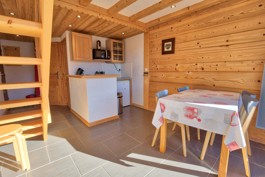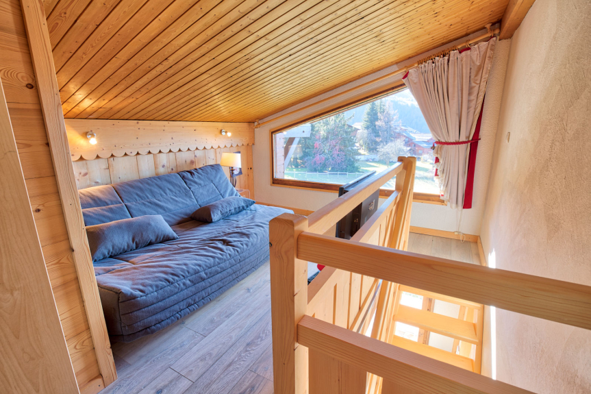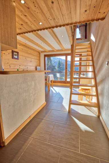 Charmant duplex pour quatre voyageurs, d'une surface de 34 m² + 8 m² inférieur à 1.80m. Situé au 3ème étage, son balcon SUD offre une vue dégagée sur le Mont Charvin et la vallée.