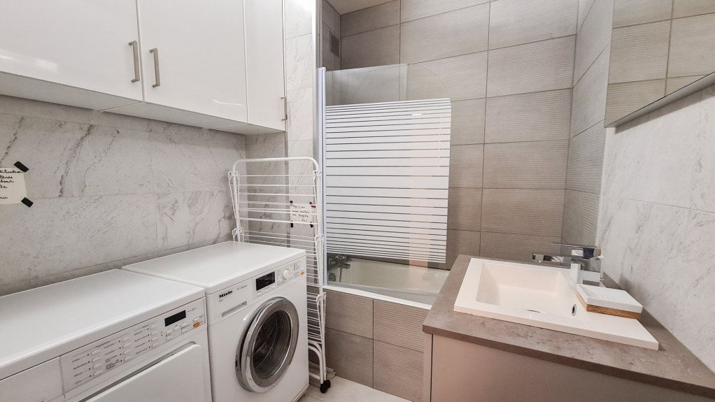 - Salle de bain avec baignoire, lave-linge Miele, sèche linge radiateur sèche serviette