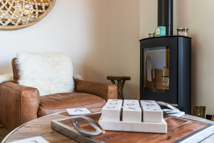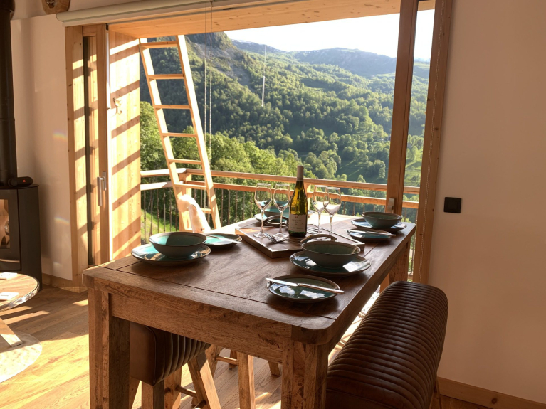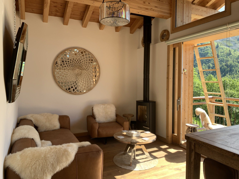 Salon autour du poële à bois, donnant sur un balcon orienté à l'ouest, avec vue dégagée sur les montagnes environnantes. Connexion WIFI pour vos appareils, mais pas de TV.