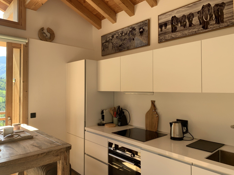 Cuisine équipée : plaques à induction, hotte, lave-vaisselle, four, micro-ondes, bouilloire et cafetière électrique (Dolce Gusto).