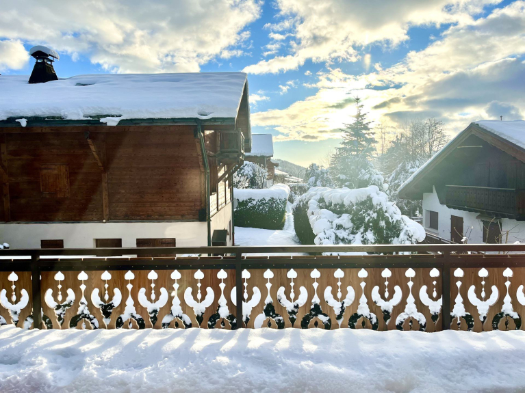Le chalet BEAU VIRAGE, composé de 2 appartements, est situé dans le village, au pied des pistes de l'Espace Diamant (téléski des Biolles), à 350m des commerces et animations, et à 500m de l'école de ski.