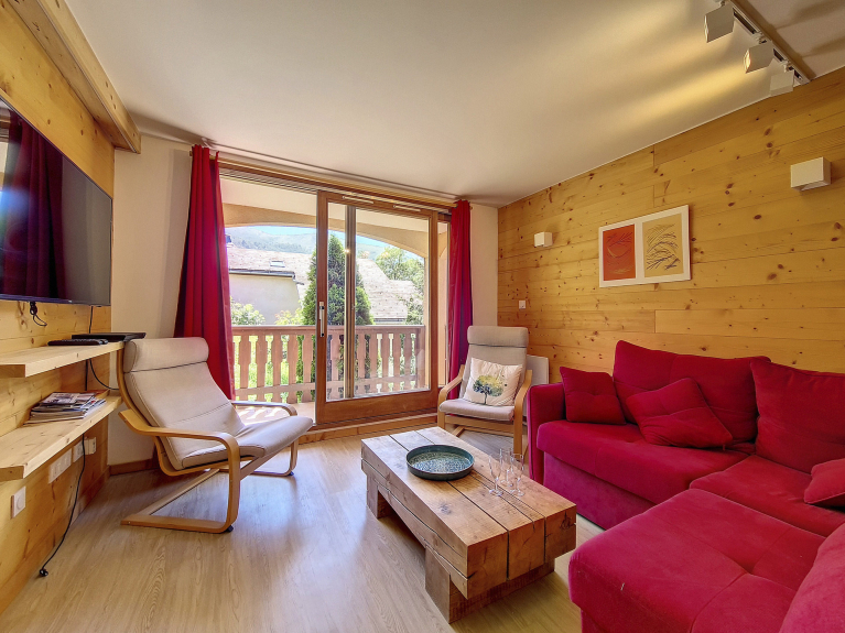 Il possède un balcon orienté Sud/Ouest et est situé au rez de chaussée, avec accès direct sur la piste.